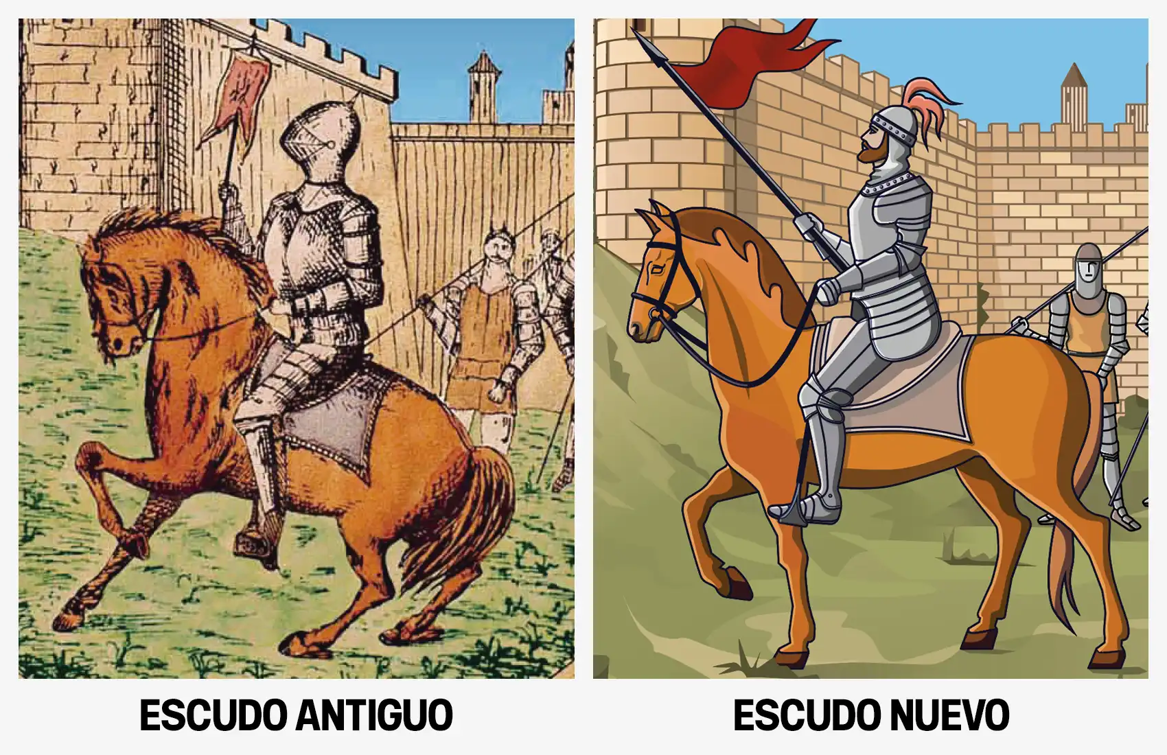 Optamos por tamaños proporcionados entre el caballero y el caballo. - Sin perjuicio de la autoridad que el caballero transmite, tornamos la posición bélica hacia una pacífica, para acercarnos a dos realidades: la naturaleza de la toma de la ciudad en 1085 y la buena convivencia de los diversos ciudadanos.
